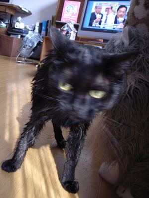 先日、激暑だったので 二匹の猫は毛むくじゃらで暑かろうと思い 洗ってあげました。 べっちゃべちゃになってカワイかったです。