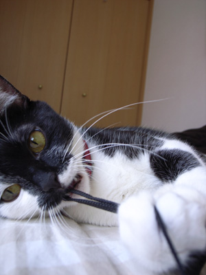 そしてこちらは カメラのヒモをがぶり。(キュート)