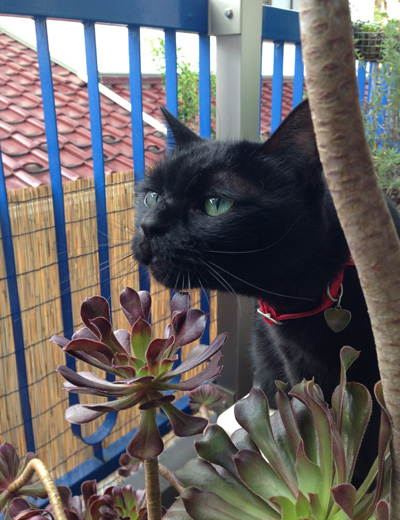 くまぽんはベランダがお気に入り。 (でも目を放すと隣の家に行ってしまうので、監視が必要なのですが‥‥。) そしてこの多肉植物の黒法師の葉を噛むのが好きなようです。